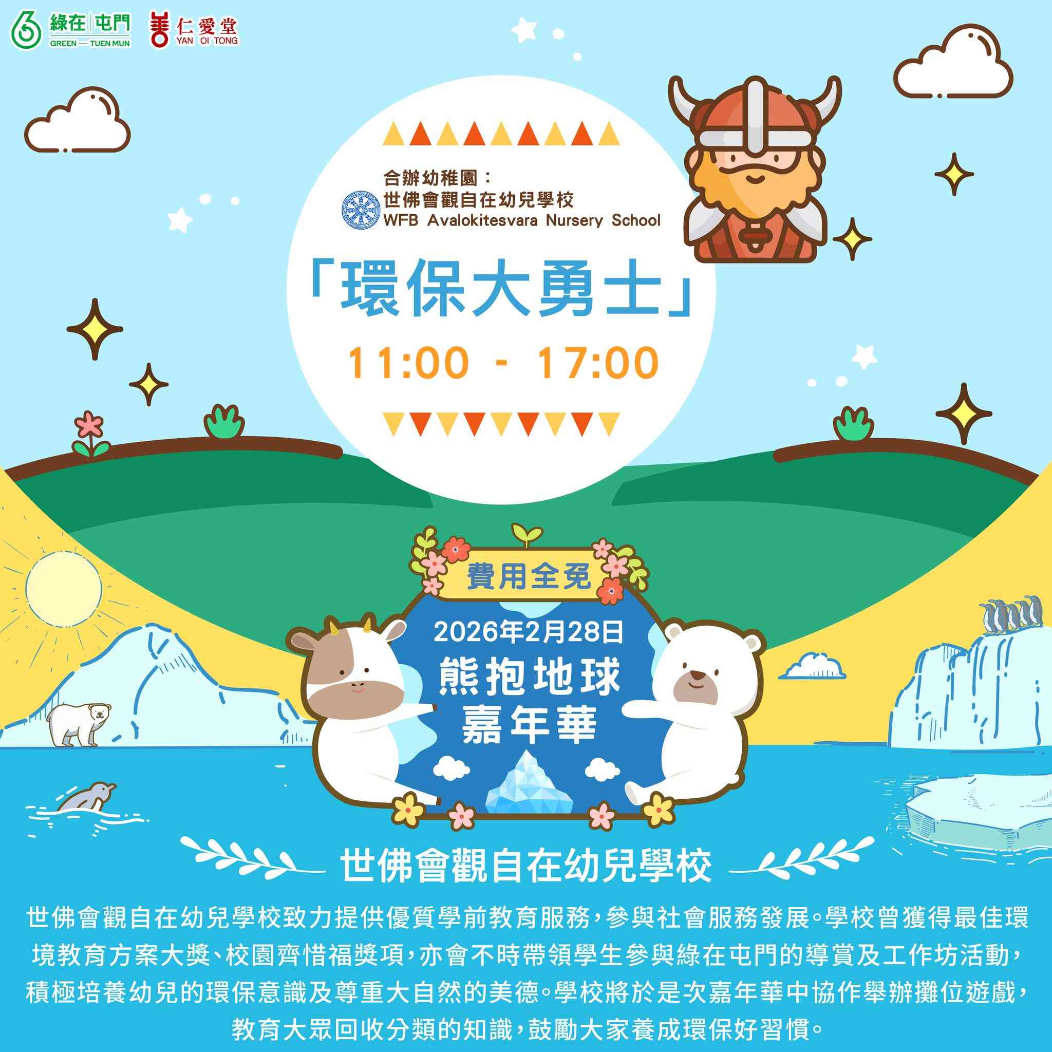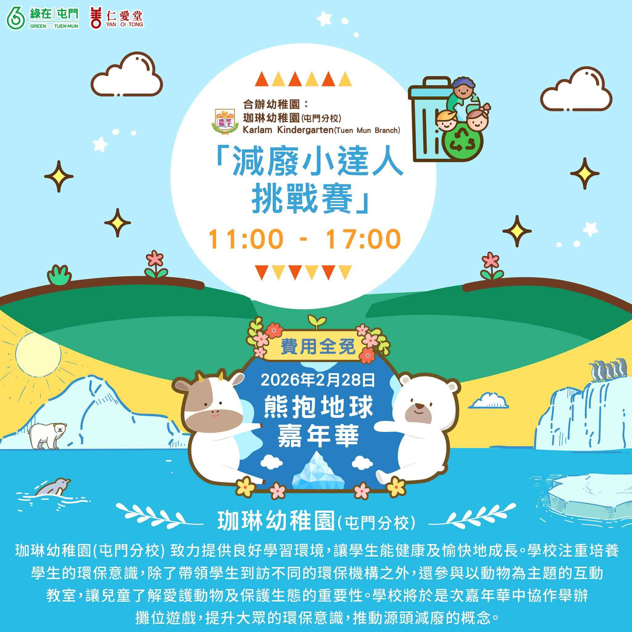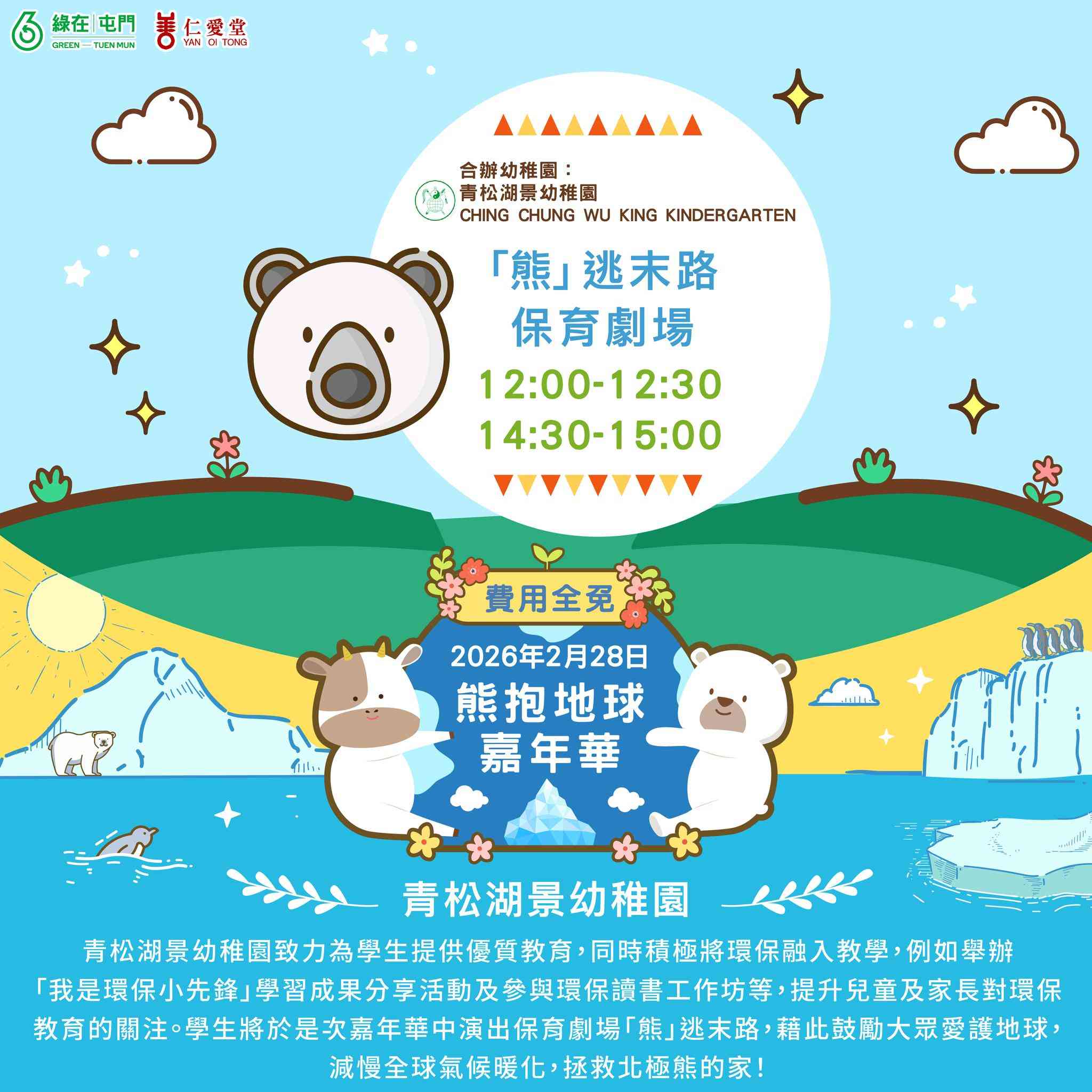 This February, 'Green in Tuen Mun' will hold a Polar Bear Carnival on February 27th, 'International Polar Bear Day', to raise awareness about climate change and how our daily lifestyles impact distant arctic ecosystems. We will promote waste reduction and energy conservation for a greener lifestyle.